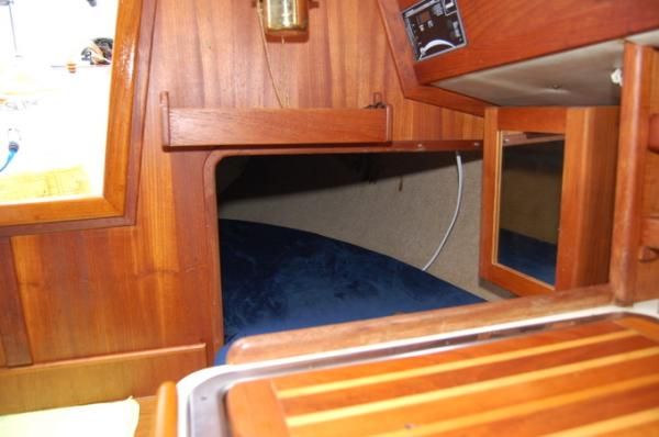 昨日見たソーラー・チャージャー・コントローラーの下には珍しい鏡付きの収納ボックス。バルクヘッドには小さなシェルヴィング。二つ共果たして自作だろうか、しっくり収まっている。尚、この艇は配電盤がSTB側にあるタイプ。VHF、チャート・プロッター等のエレクトロニクスもそこに付いている。