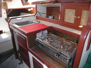 ギンボル(ジンバル)の2口コンロは非圧式アルコールのようだ。室内の殆どに使われている赤茶っぽく見えるウッドはホンデュラス・マホガニーだという。